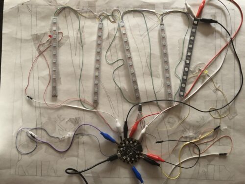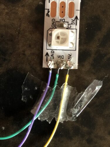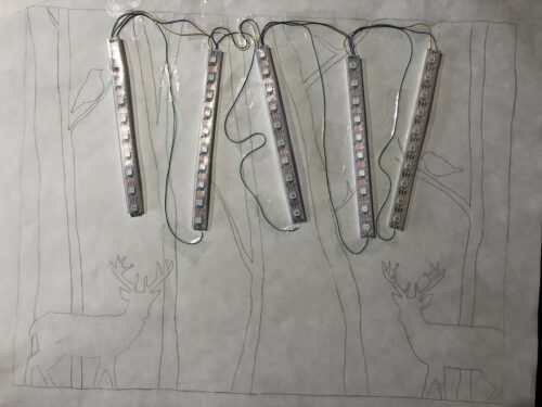 Arrange the neopixel strips between the trees drawn on the poster board as you’d like and tape the wires down.