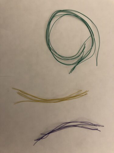 Get three different colors of wire, one for data, one for ground, and one for power. For ground and power, cut four 4-inch wires each and for data, cut four 9-inch wires. Strip both ends of all of them. I used purple for ground, yellow for power, and green for data.