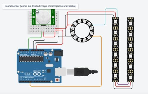 Upload the sketch by clicking on the Upload icon, shown in the annotated photo. Lights should flash on the Arduino while it uploads. When it finishes uploading half the LEDs on the neopixel ring will light up yellow on and off. Blow or talk near the painting and neopixel ring will change color into white and the strip will light up. Check the solder on any LEDs that don’t work.