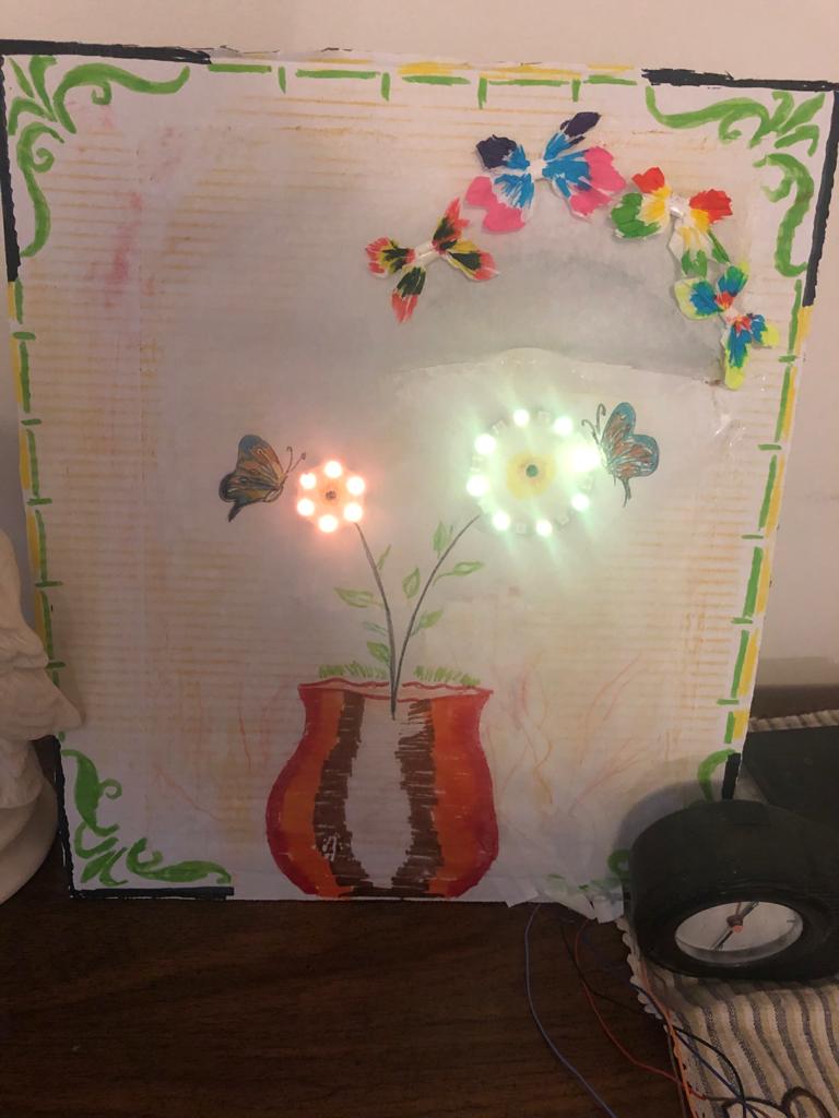 For my project, I made a sound reactive interactive painting.Interactive painting is project consisting of floral painting. The main two flower are made up from neopixel rings and they keep on glowing on and off. They change their color based on the loudness of the sound that the sound sensor picks up on the Circuit Playground Express Project also uses neopixel strip that glows based on the data capture from sound sensor. Painting can be used anywhere like at home or outside anywhere.