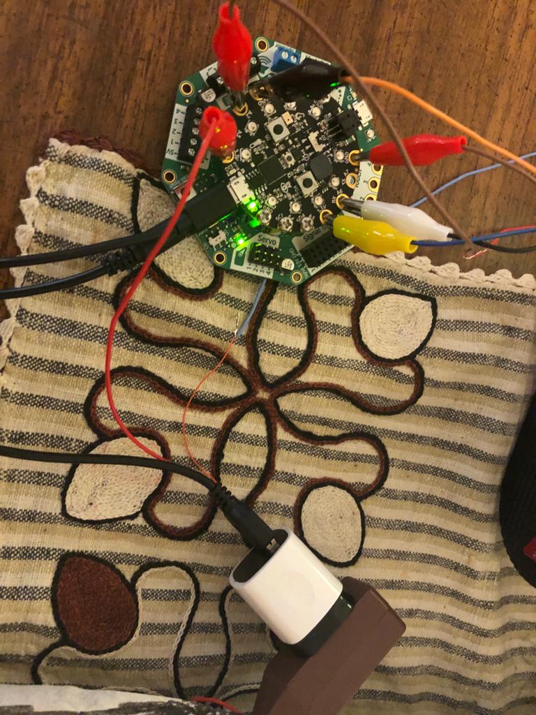 Plug the Circuit playground cable with the printer cable and plug it into electric switch. Once plugged in the flower will start to glow and the more louder the sound then neopixel ring will change color and strip will light up illuminating the butterflies.