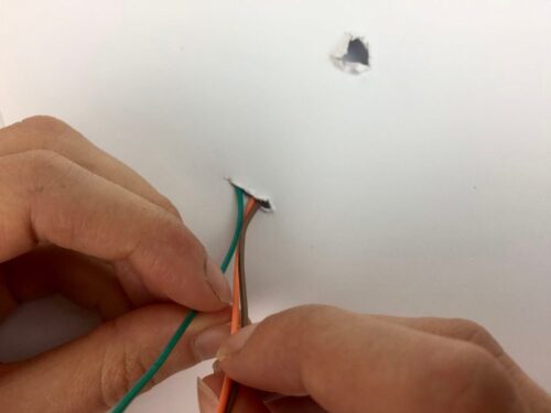 Make two holes in the white cardboard and insert all the wires on the back side of the white board.