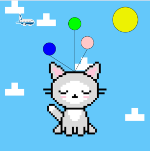 This drawing is called “Fly Away Kitty.” It features a blue background with a large pixelated cat held up by three balloons. In the background there are white clouds, a yellow sun, and an airplane flying across the X horizon. When the viewer presses the mouse down, a red heart will appear. It is a moving picture; the cat and the balloons float up and down.