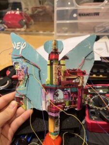 I wanted to create an interactive piece where it is shaped like a butterfly, and when you make its wings flap, the LEDs turn on. The switch aspect in this project is the loop made out of conductive fabric tape touching the copper tape to close the circuit and turn the LEDs on.