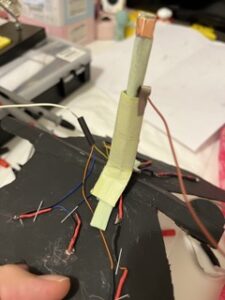 The positive wire should go through the hole/middle of the lever. I then cut and stripped the positive wire and placed it behind the copper tape. I soldered a wire to the positive(red) wire of the battery pack, and after stripping its end, I attached it to the fabric tape loop.