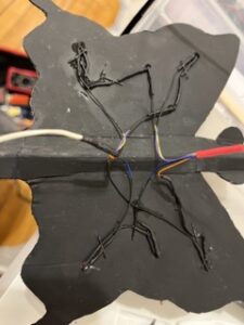 For each wire, I would have two LEDs connected in a series. In total I used two thinner wires per wing, having a total of four wires on the entire butterfly. I soldered the wires to the LEDs and placed heat shrinks around the exposed sections, with red representing positive and black representing a negative charge.