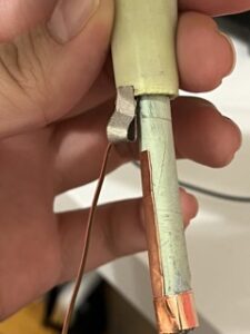 I curled both pieces to create tube-shaped parts and taped them to keep their shape. I then cut each piece down the middle byhalf an inch or so to create little arms. Each part should now resemble a “T” shape.I then slipped the shorter/thicker tube with fabric tape around the longer tube with copper tape.