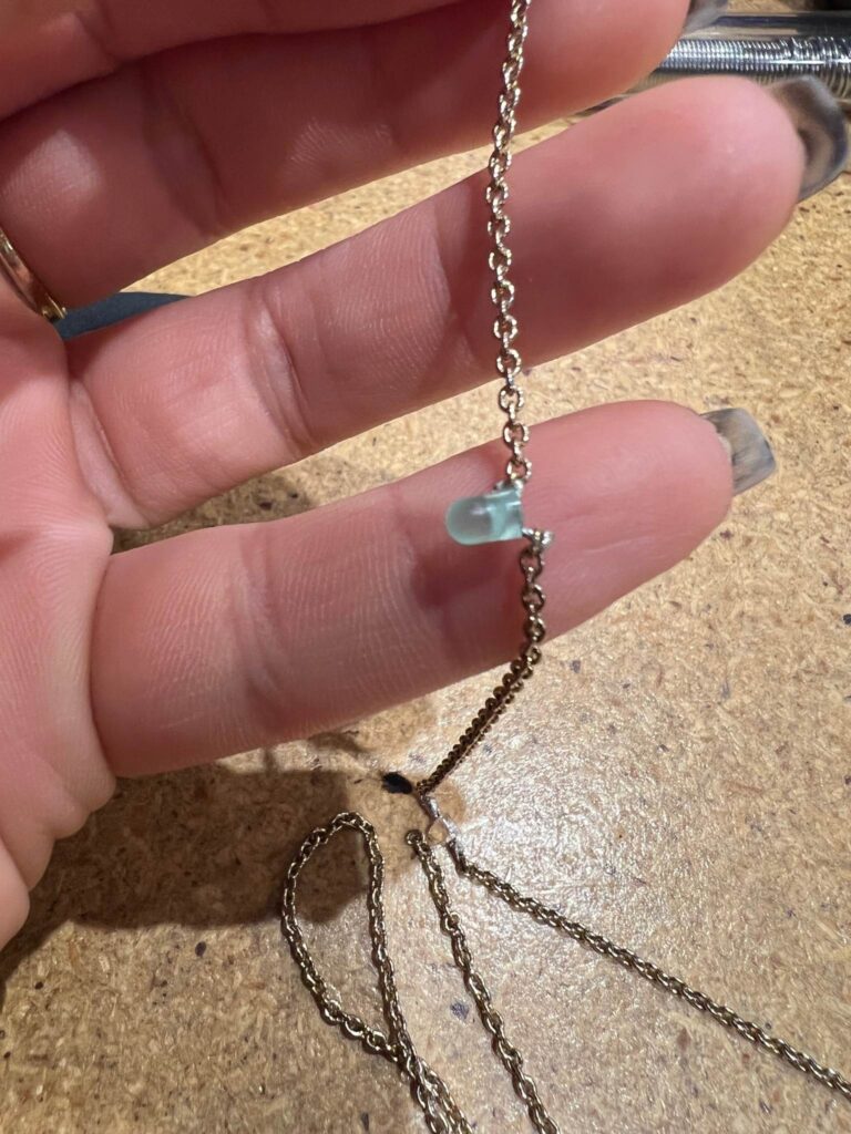 Utilizing the wire cutters, I cut off links of the necklace where I wanted the LEDs to be. I then used pliers and tweezers to help loop the wire from the LED into the link and wrap it around to secure it. I then used the soldering iron to close up the loop for extra security.