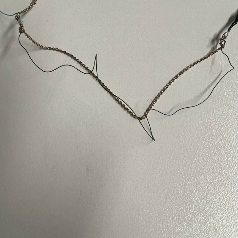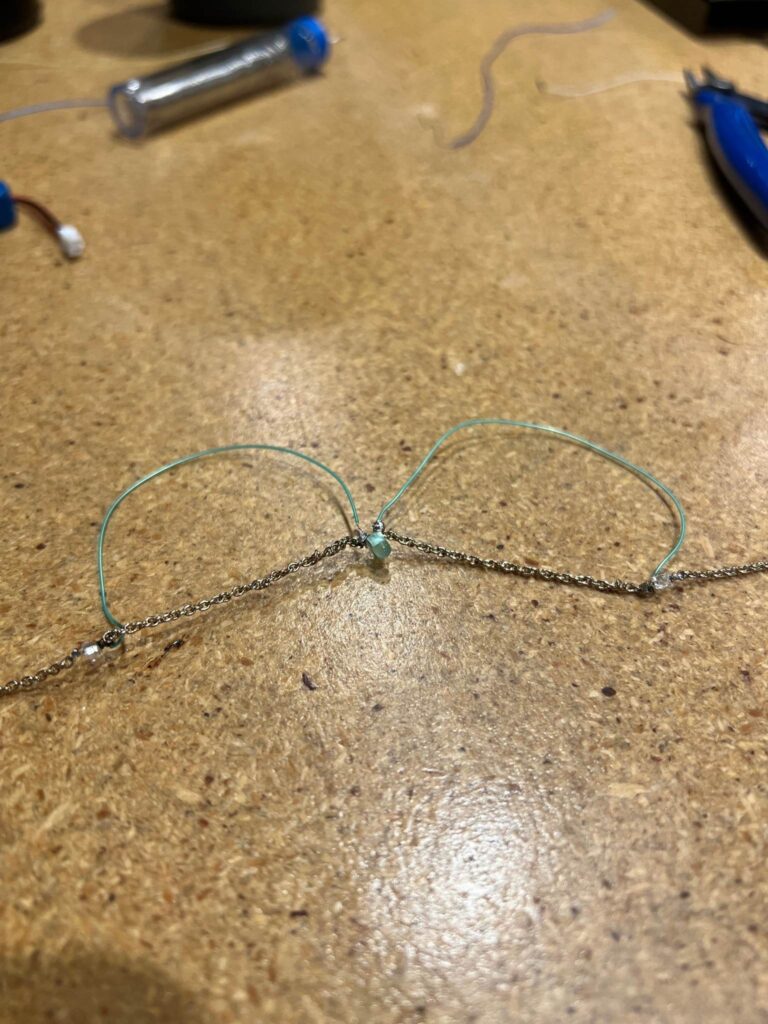 When collecting my materials I found that the coating on the necklace was stopping it from being conductive. I failed at trying to take off the coating so I went to plan b. Too keep a presentable (for wearing) color scheme I chose teal and green wires. After cutting two pieces of teal wires to the length I wanted I stripped the ends to start connecting the LEDs. I soldered the wires to the same spot I soldered the ends of the LEDs.