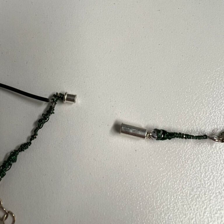 I then cut the green wire to scale and scraped off the coating from the ends. These pieces are placed to connect the LEDs to either end the clasp.