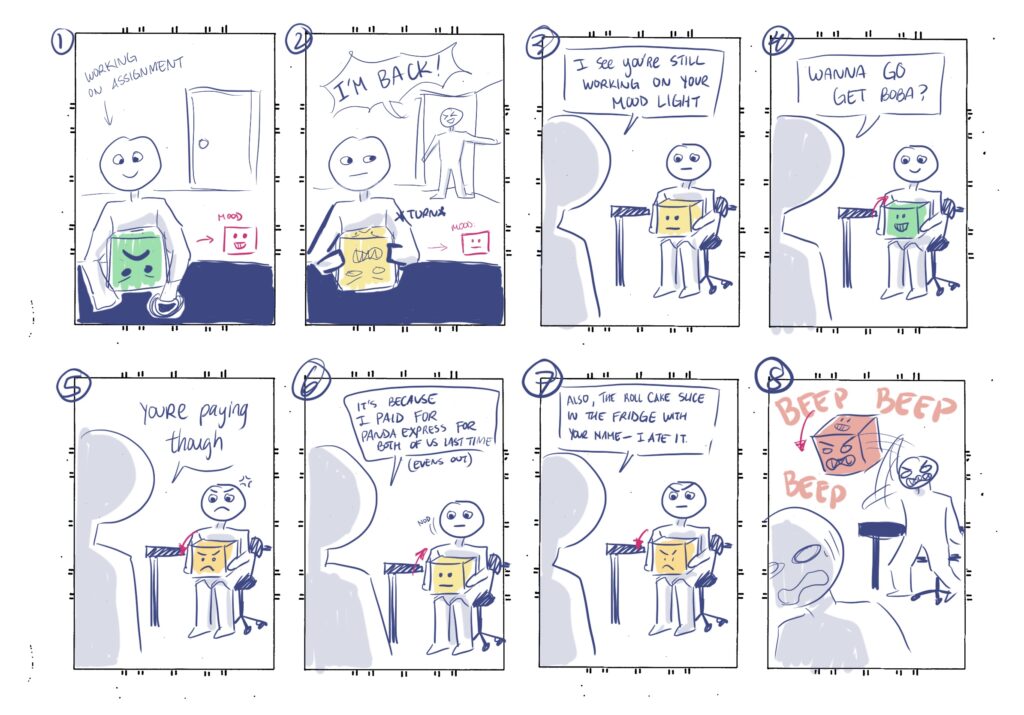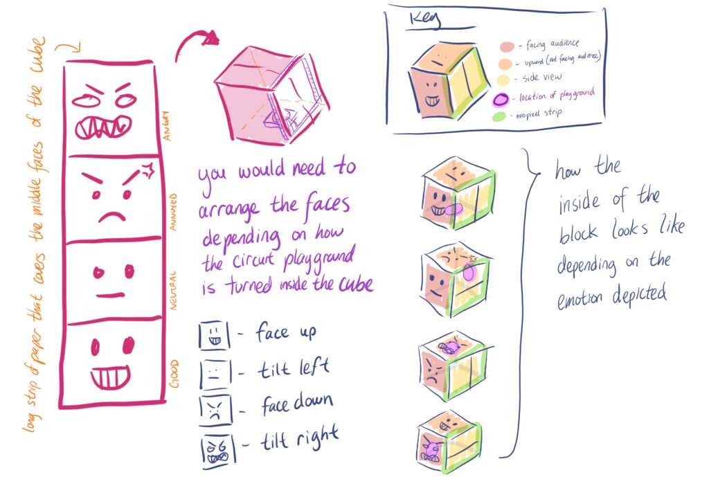Inspiration: I was inspired by reversible plushies and how the mad and happy expression on the object depicted the emotion of the user by the way the user flips it. In this instance, depending on the face of the cube a specific emotion is expressed.