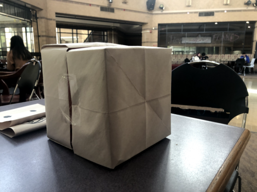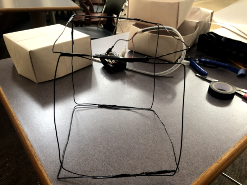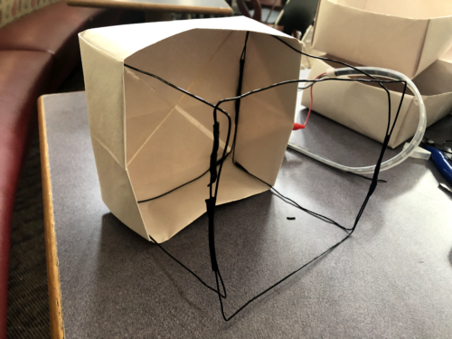 Using the strong wire, create a frame for the origami boxes. I created 4 squares that matched the perimeter of the square face of the origami boxes. I taped the 4 squares side by side, and taped the first and last square’s sides together in order to make the frame.