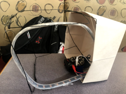 Using painter’s tape, attach the internal part onto the middle of the bottom rectangle side of the cube. Attach the neopixel strip to one side of the wire frame using clear tape, so the light can be seen through its transparency.