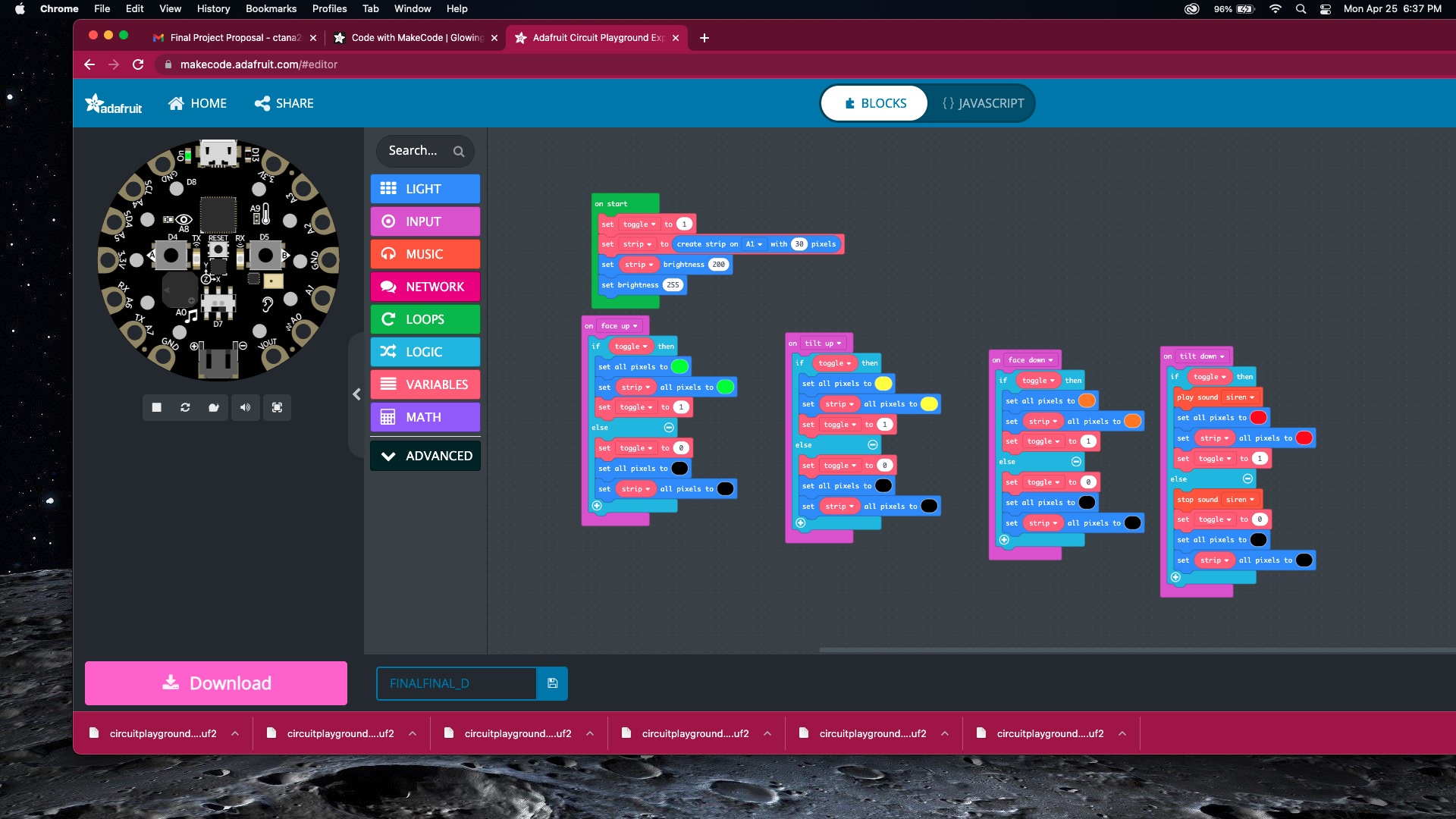 Using MakeCode, create the code for circuit playground. In this case, based on the tilting of the playground it will display a different colored light onto itself and the neopixel strip, and make a sound on the red light.