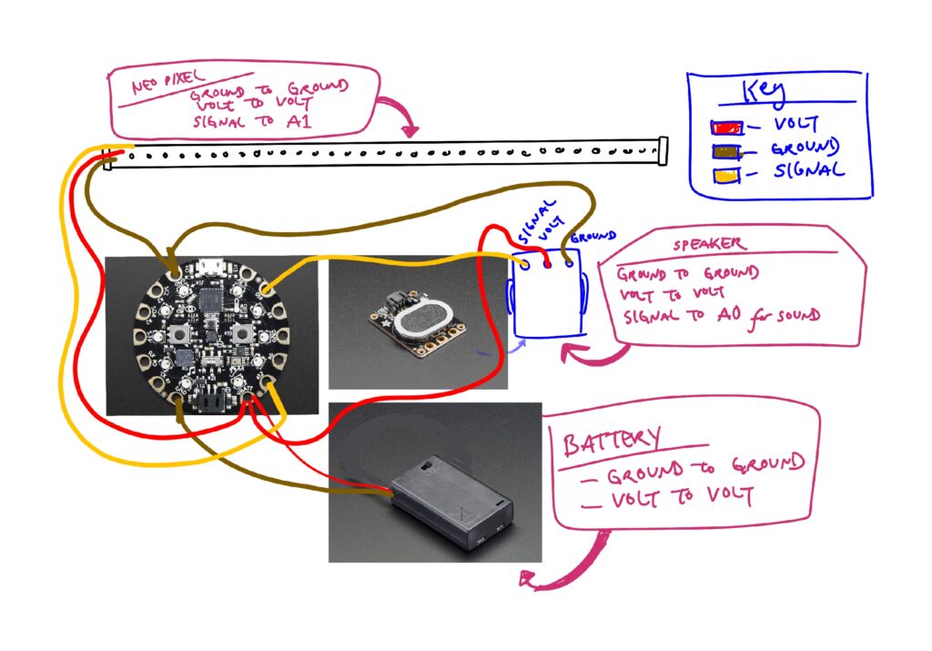 I forgot to take pictures, but this is how the wiring would go with the speaker/battery pack onto the circuit playground. Loop the ends of the rainbow wire through the designated parts of the circuit playground and cover any exposed wire with electrical tape.