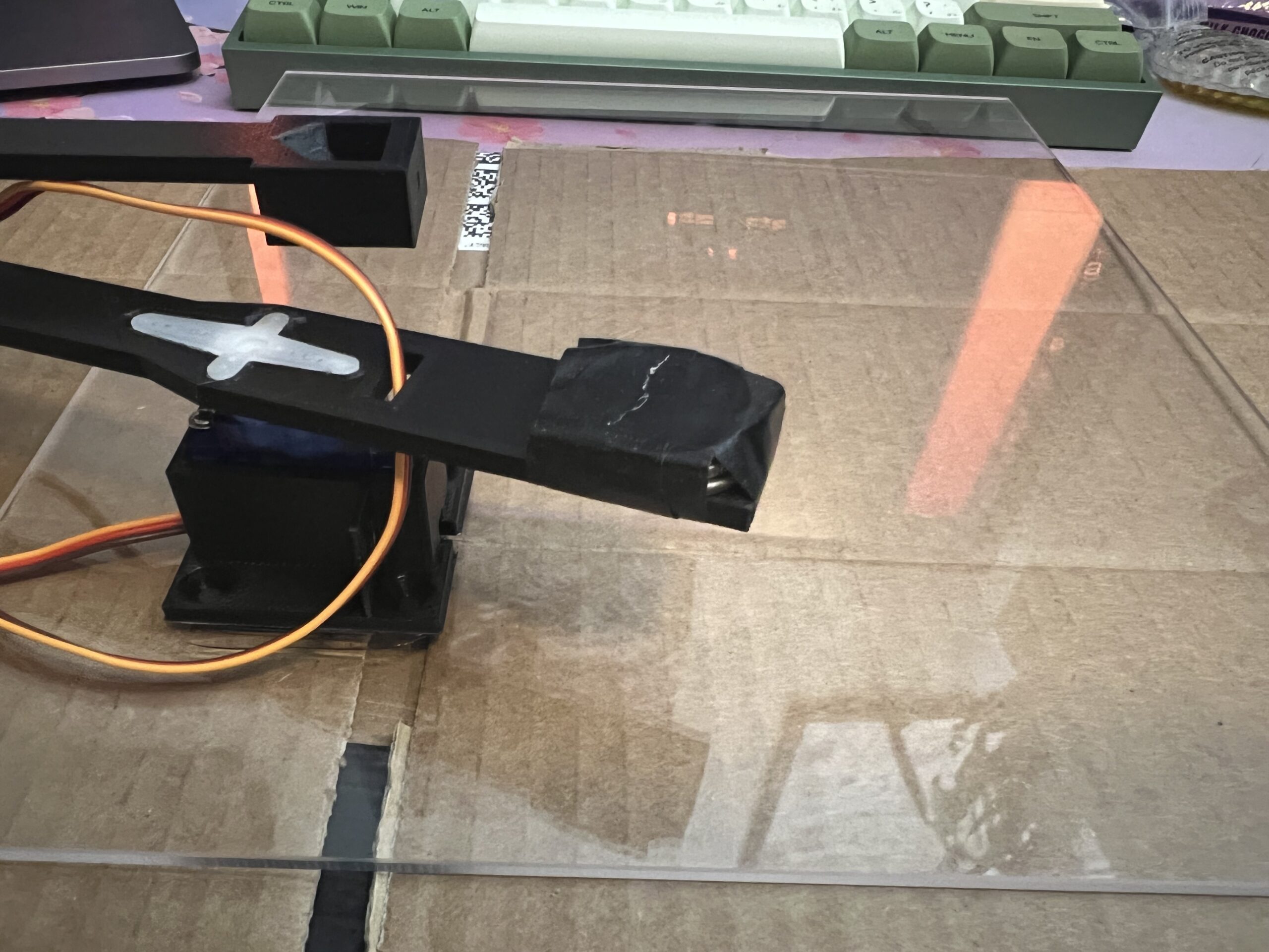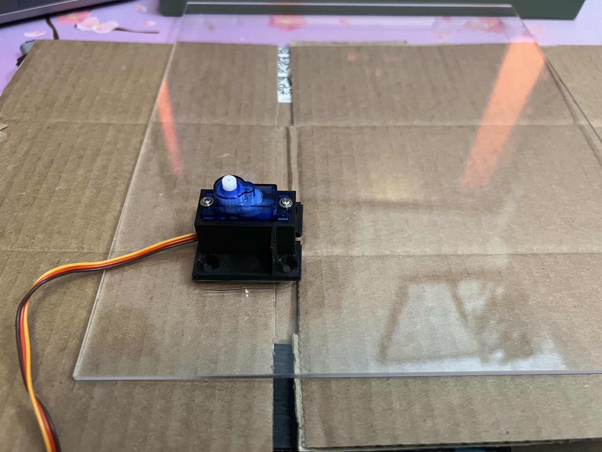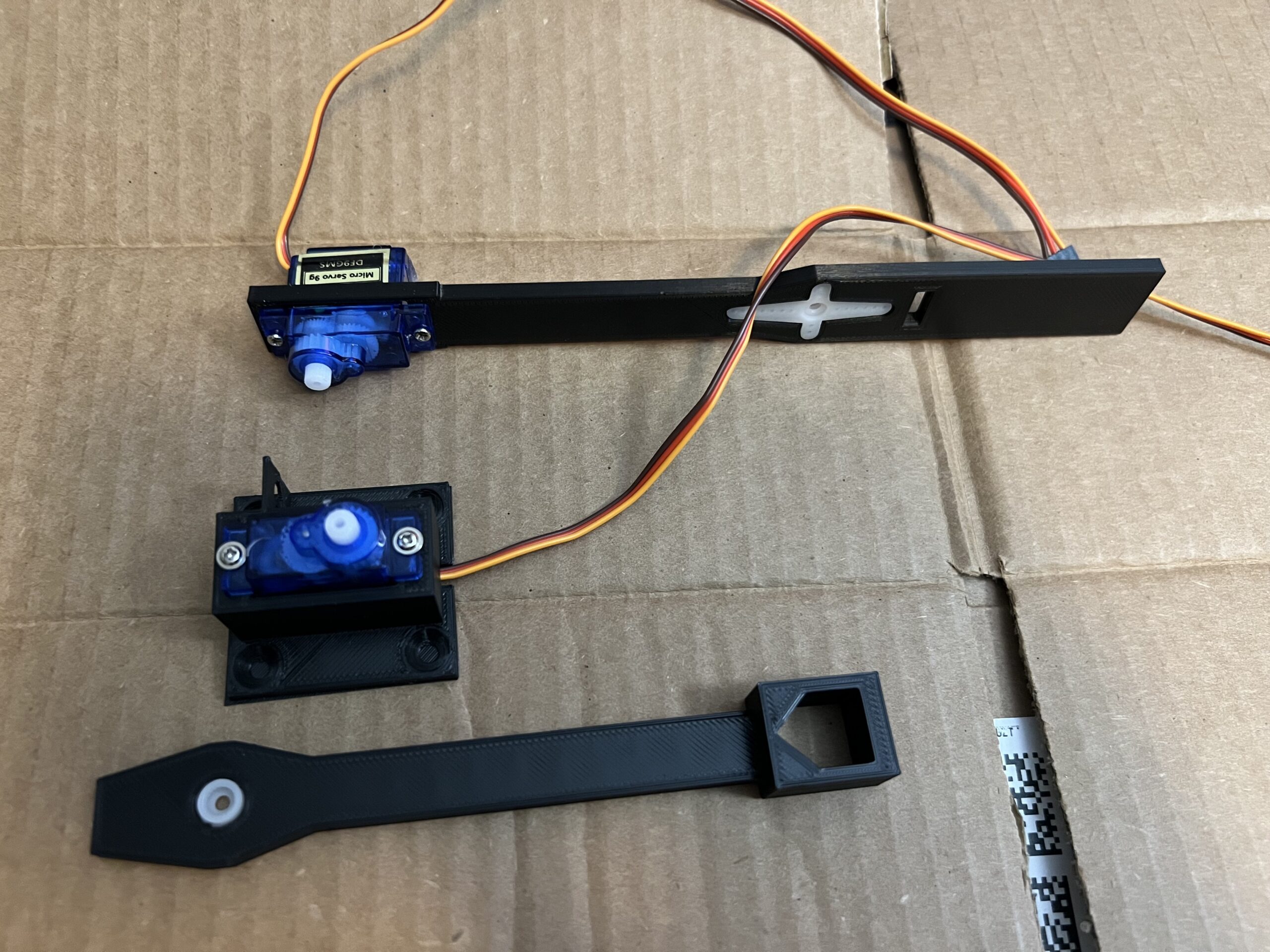 Attach one servo to the baseplate, and the second to the arm. Glue in the servo attachments as well.