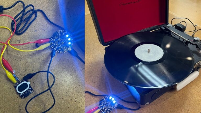 For my interactive project I chose to make an interactive coded song. First, I started off by choosing a snippet of a song I wanted and then converting it from an mp4 file to midi file. Then upload it to a site that converts the song into a code for Arduino. The outcome ended up being a melody made of beeps that take from the melody of the song. Then in order for the song to become more interactive I played with a tachometer code that uses the lights on the circuit playground to sense motion. The song code and tachometer code were then combined to create the final code for this project. In terms of how one would interact with this is I used a record player and a thrifted record. The record player allows you to adjust the speed of the record when it plays, so I hid the circuit playground under the tip of the record where I placed reflective tape so that it would reflect off of the LEDs and sense how fast the record was going. When you change the speed the song will play slower or faster depending on the speed you set it to.