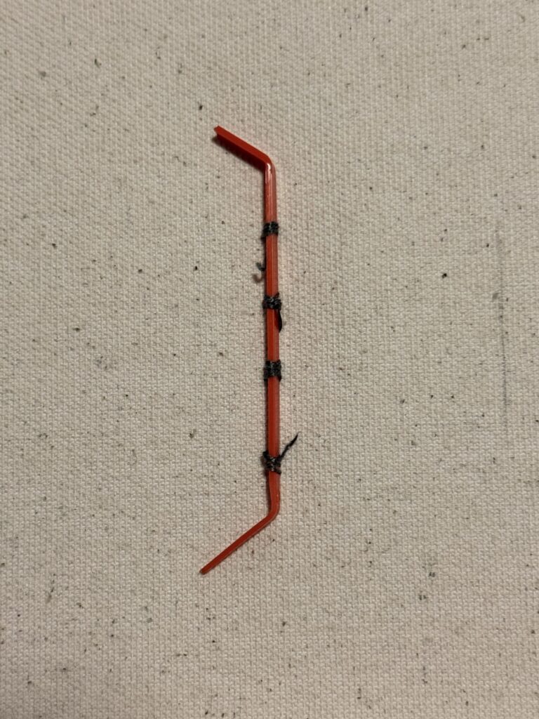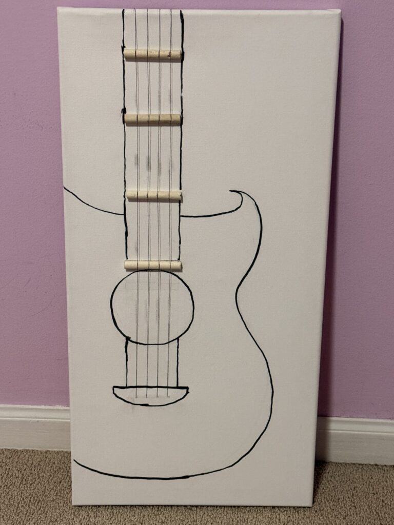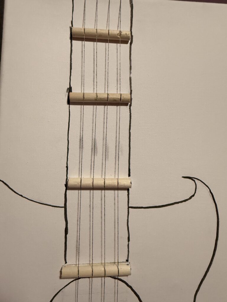This picture shows how the strings are arranged, and it also shows the four small wooden sticks I used to create the guitar’s shape and help hold the strings in place.