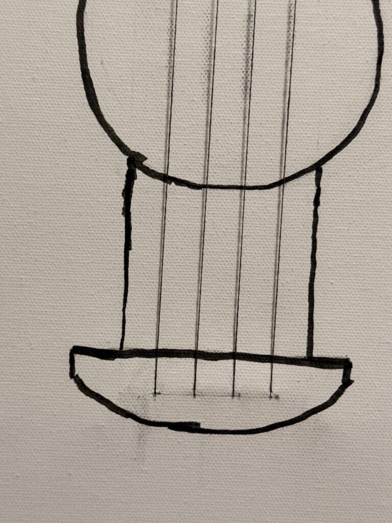 I created a guitar design on a canvas and attached four conductive thread strings to it. In the first picture, you can see how the strings are secured on the front of the canvas. The second picture shows the back, where I made small holes using a safety pin and used small pieces of plastic zip ties to hold the strings tightly in place.