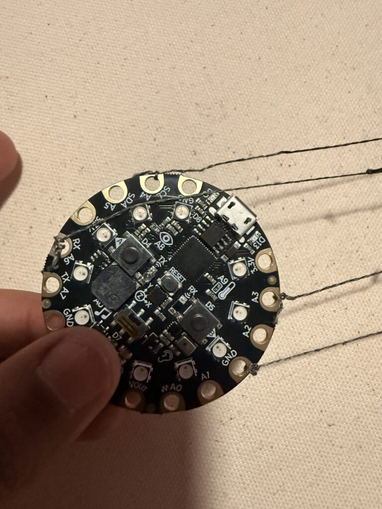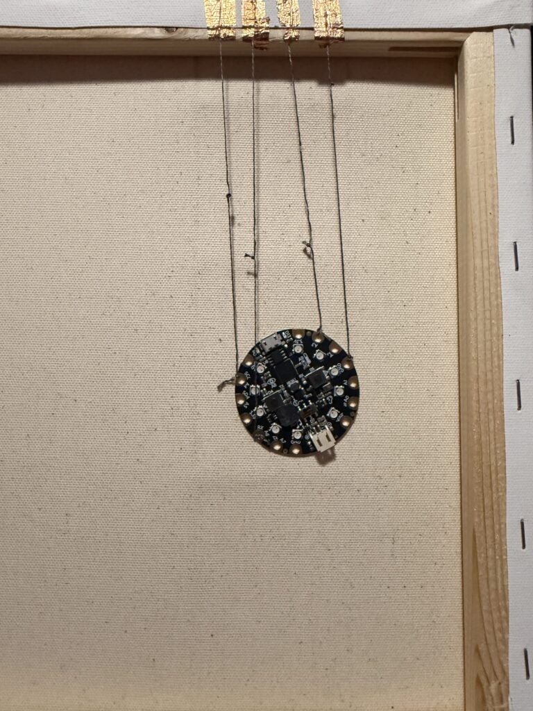 My project is an interactive canvas that uses conductive thread as touch-activated sensors to play music. Each of the four threads represents a different melody: three Bollywood songs and one Christmas song, “Jingle Bells.” When the viewer touches any thread, the Circuit Playground detects the gesture through capacitive sensing and instantly starts the corresponding melody. The gesture of touch becomes the central interaction allowing the user to switch between songs at any moment simply by touching another thread. This creates an engaging, playful experience where sound and art respond directly to human gesture, turning the canvas into both a visual and musical instrument.