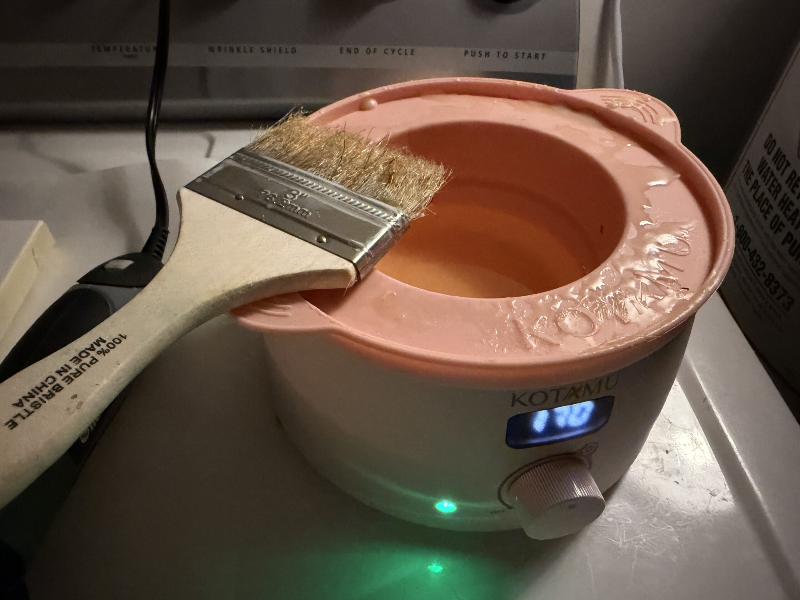 - Preheat encaustic medium in wax warmer pot. Make sure you know what temperature to bring the wax to!