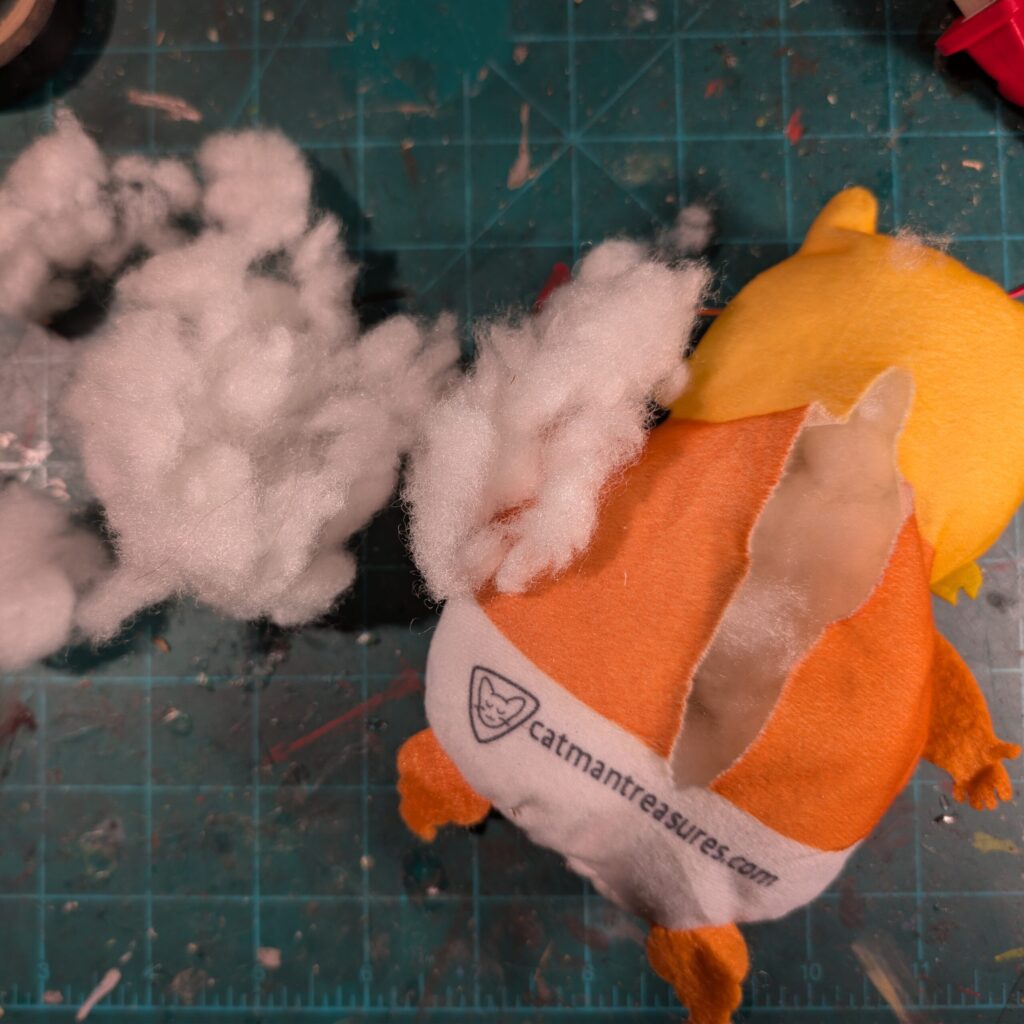Cut open a slice in the back of your plushie, and hollow out the stuffing inside, it will get in the way, so make sure to take out enough.