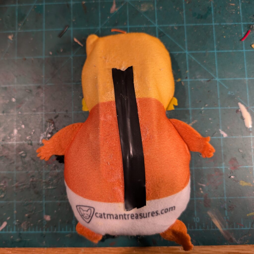 Carefully place your electronic inside of the plushie, and place the speaker near his mouth area. Then, tape it up when youre done.