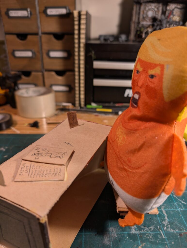 To expand on our original idea for the Trump voodoo doll, we decided to add more context to the scene in which he would be. Swapping out the original touch sensor for a movement sensor, the idea is that he would be in the Oval Office surrounded by caricatures of Trump’s misdeeds. Trump now sits on a chair, and while powered, he will constantly start saying one of the stored voicelines in his SD card. Whilst removed from his chair, his voicelines will change!