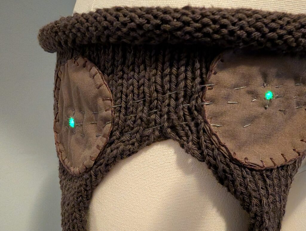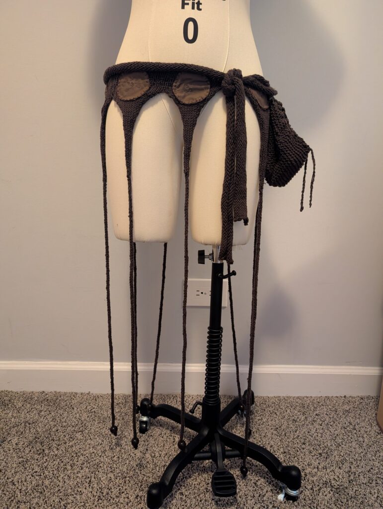 I started with the base of the skirt. I hand-knit it on both 5mm circular and double-pointed needles before sewing on the circles and adding the beads on the ends. I then knit a small drawstring bag to hold the Arduino and battery pack.