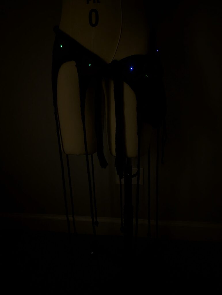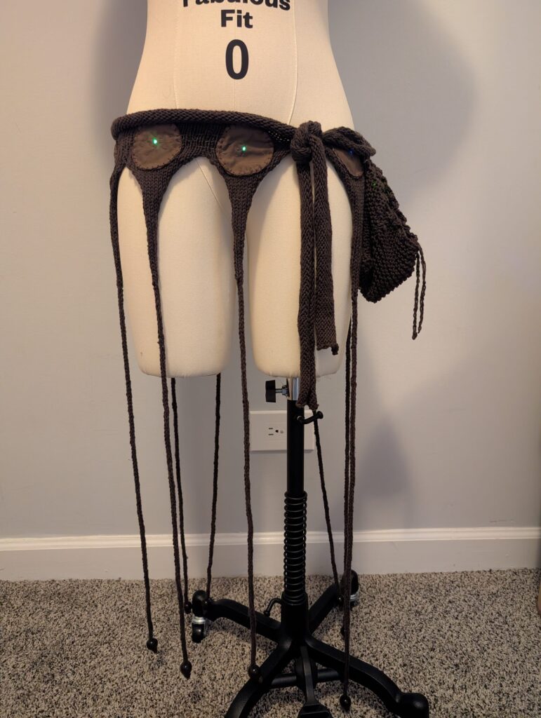 For my interactive project, I created a knit skirt inspired by bioluminescent deep-sea creatures. The idea is to program a Lilypad Arduino to control the colors of a series of eight Neopixels. These Neopixels are sewn evenly around the waist of the skirt. Through movement inputs measured with the built-in accelerometer on the Arduino, the lights change color accordingly. The Arduino and battery are held in a free hanging bag to allow the largest range of movement while being worn. This bag is attached through three separate conductive snaps. These snaps create the connection between the Arduino and the Neopixels.