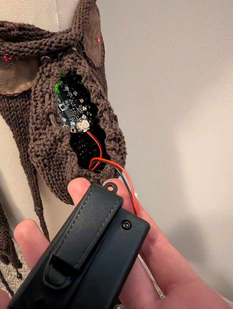 I sewed in the Arduino, making sure to connect data, power, and ground to the corresponding snaps.