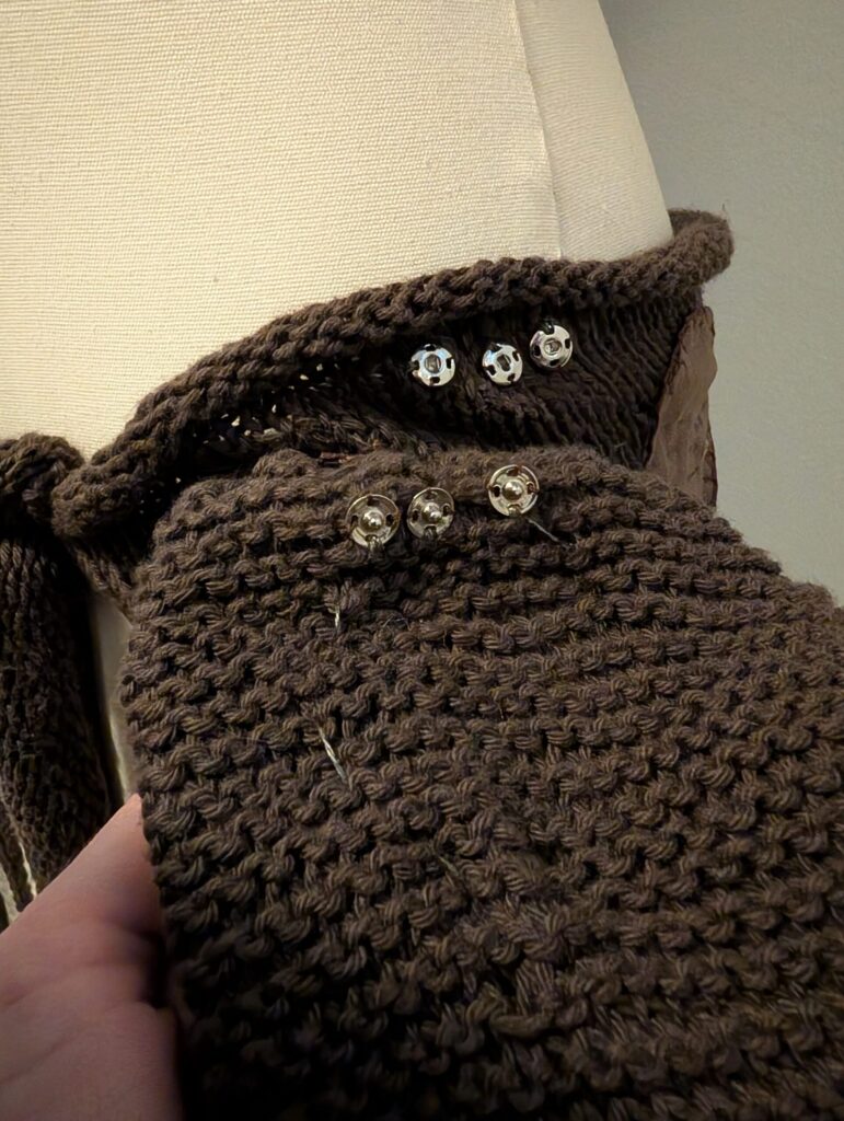 I stitched three conductive snaps on to the back of the drawstring bag that will attach to the body of the skirt. These snaps are connected to the Neopixels through a bit of extra stitching.