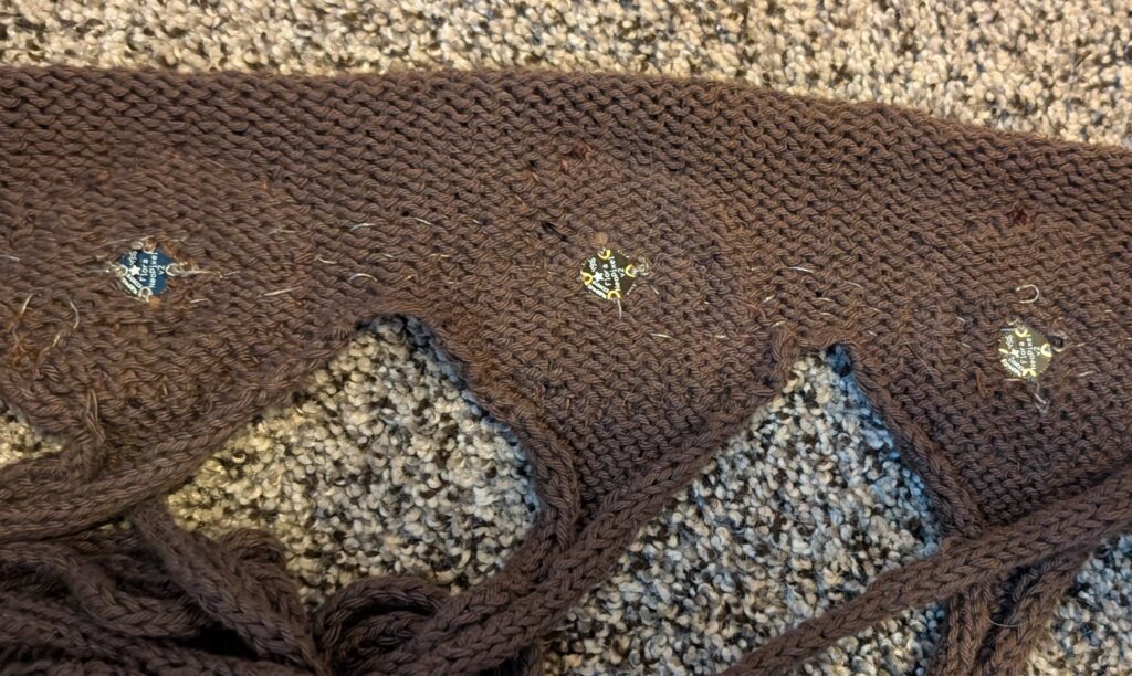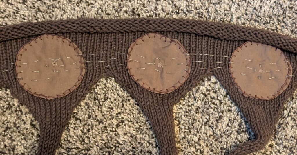 Next, I stitched on the Neopixels. I made sure that each was facing in the right direction. Each was stitched behind the fabric circles in order to diffuse a bit of the light.