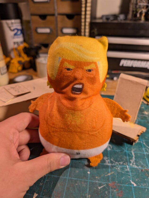 To expand on our original idea for the Trump voodoo doll, we decided to add more context to the scene in which he would be. Swapping out the original touch sensor for a movement sensor, the idea is that he would be in the Oval Office surrounded by caricatures of Trump’s misdeeds. Trump now sits…