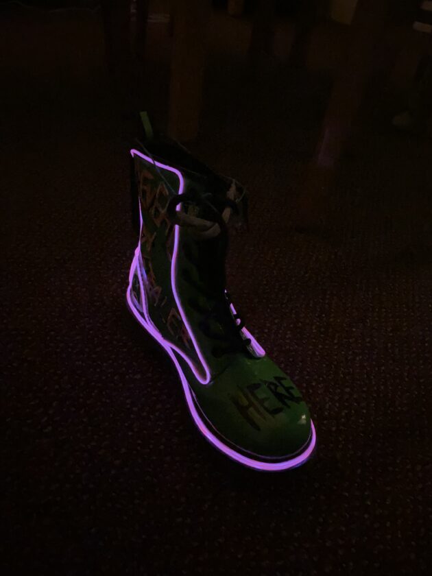 For my final project I wanted to make use of something that I already own and utilize EL wire since it’s not really a common material. I found some green boots that I thrifted in the past and decided to spice them up with some graphic designs. Materials: Pink EL wires (amazon) Green boots…