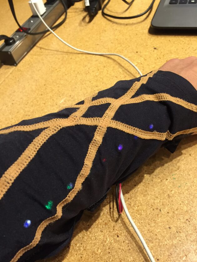 “Piano Sleeve” – Final Materials: Copper tape red lose wire green lose wire Adafruit MPR121 capacitive touch sensors Adafruit Trinket Pro 5V Proto Board Tiny audio buzzer Adafruit liion/lipoly backpack battery 2 compression sleeves Sewing thread and needle velcro strips 2 Neopixel strips CODE: #include <Wire.h> #include <Adafruit_MPR121.h> #include “pitches.h” //#include <LED_animations.h> #include <Adafruit_NeoPixel.h> #ifdef…