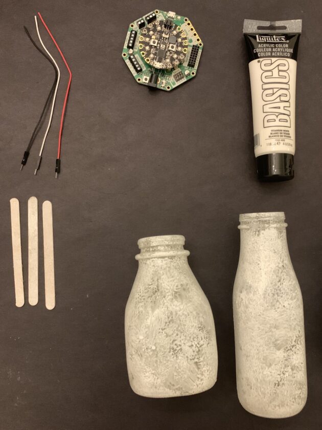 Materials Needed: Circuit Playground Crikit (optional) 3 neopixel strips with at least 5 neopixels Thin wire Alligator clips with female end Soldering Iron Hot glue gun Solder Popicle sticks Glass Jars White paint Paint sponge Instructions Step 1 : Paint glass jars with a thin layer of white paint using a wet paint sponge, also paint…