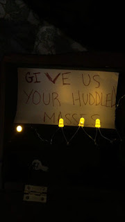 1) Found a box that opens and closes to signify a door 2) added conductive tape to the edge of the box so that when it opens it touches the wire and coducts electricity to the battery therefore closing the circuit 3) linked 4 LED’s like protestors protecting the message “give us your huddled masses”…