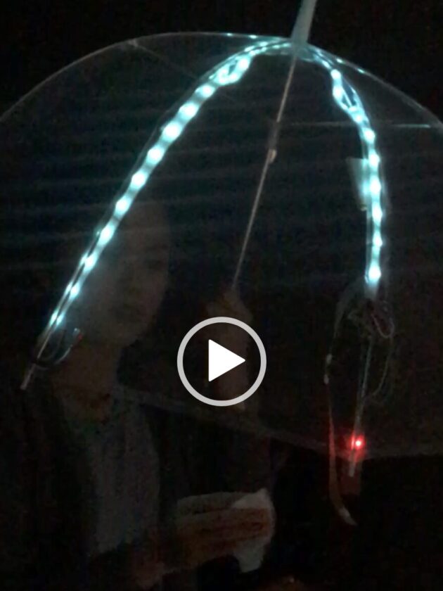 Hello all. For my final project I made a rain detecting umbrella. To get started the things you will need are: An Umbrella 1 Adafruit Circuit Playground 1 battery pack with batteries 1 JST 2 pin cable for the battery 3 Alligator clips 1 strip of 60 LEDS Scotch Tape 2 wire nuts The first…